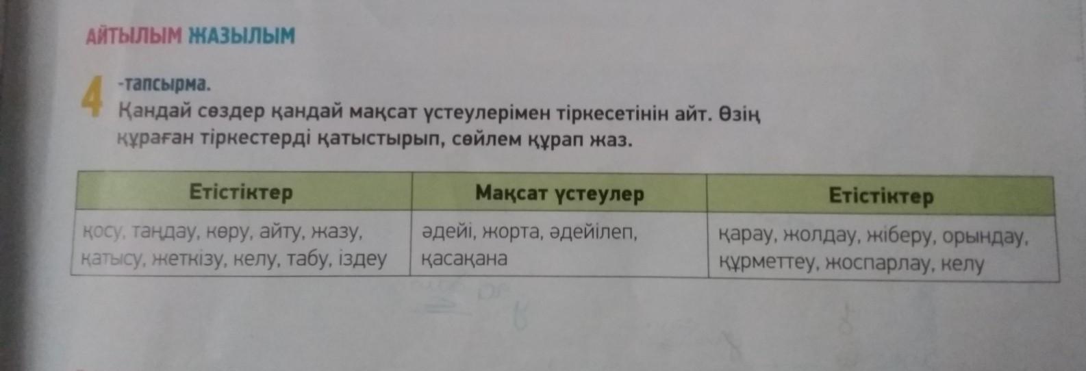 4-тапсырма. Кандай сездер кандай максат устеулерiмен тіркесетiнiн айт. Өзің құраған тіркестердi катыстырып, сейлем курап жаз.