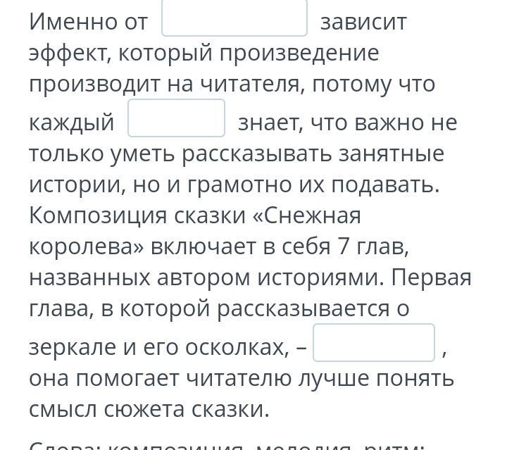 Слова: композиция, мелодия, ритм; учитель, автор, главный герой; заключение, эпилог, присказка.