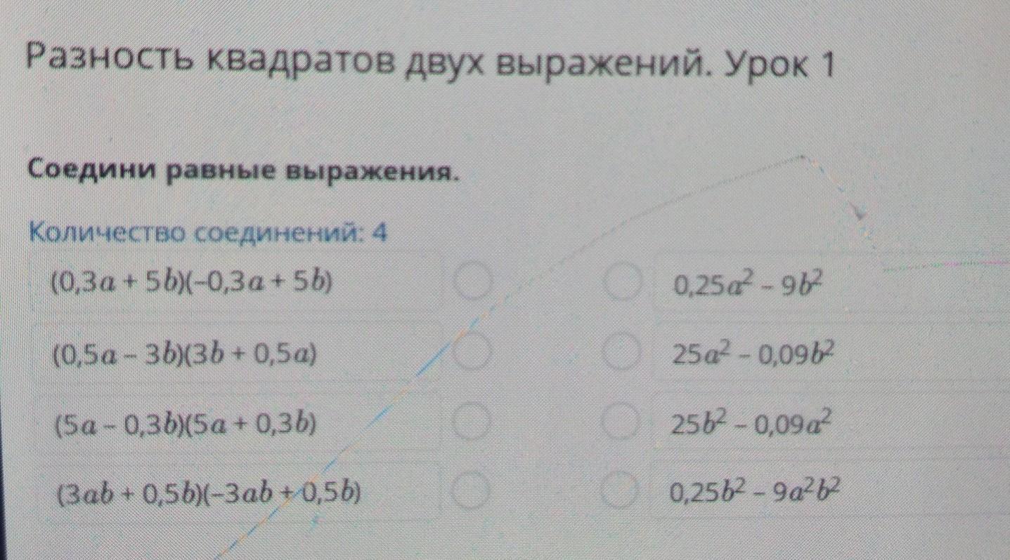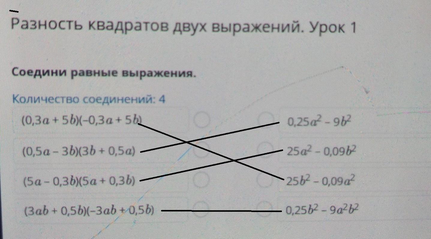 Разность квадратов двух выражений. Урок 1 Соедини равные выражения.