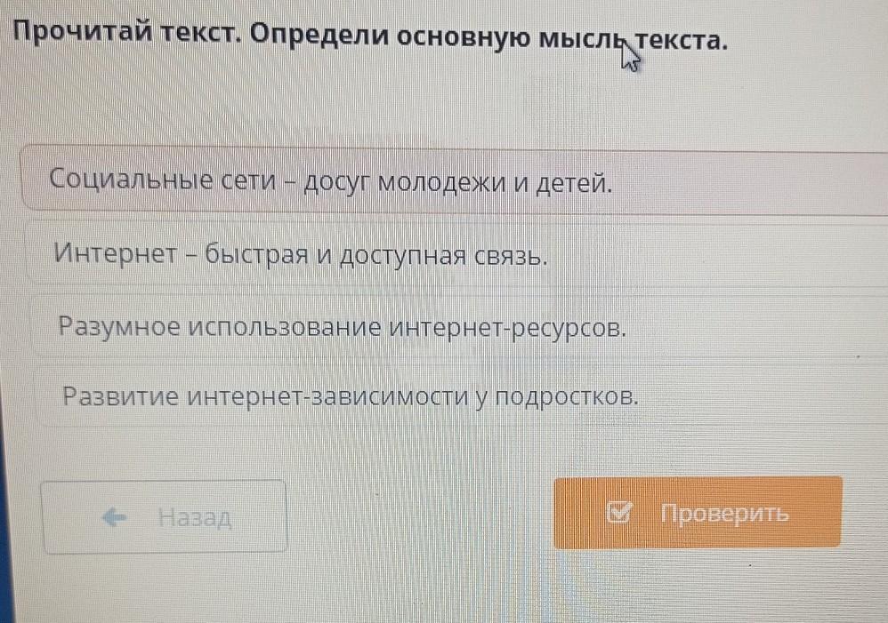 Прочитай текст. Определи основную мысль и Социальные сети - досуг молодежи и детей. Интернет — быстрая и доступная связь Разумное использование интернет-ресурсов. Развитие интернет-зависимости у подростков. Ки Назад Проверить