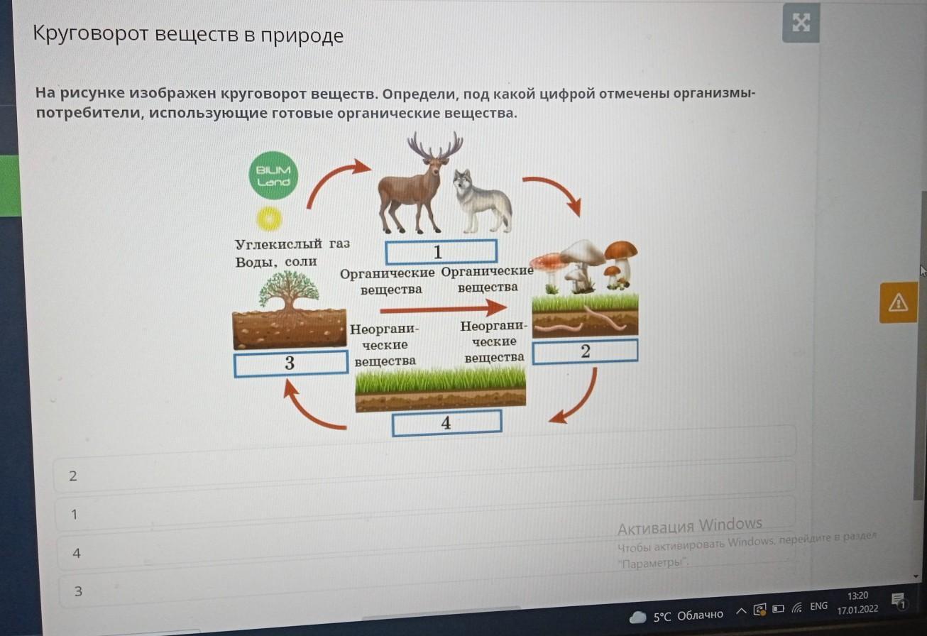 Круговорот веществ в природе На рисунке изображен круговорот веществ. Определи, под какой цифрой отмечены организмы- потребители, использующие готовые органические вещества. BLM Lend Углекислый газ 1 Воды, сон Органические органические вещества вещества Неоргани- ческие вещества Heoprasz- geckie вещества 2 3 4 2. 3.