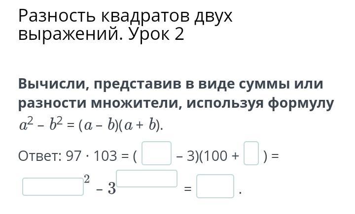 Вычисли, представив в виде суммы или разности множители, используя формулу a2 – b2 = (a – b)(a + b).