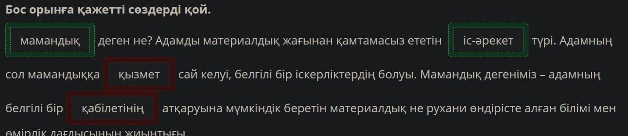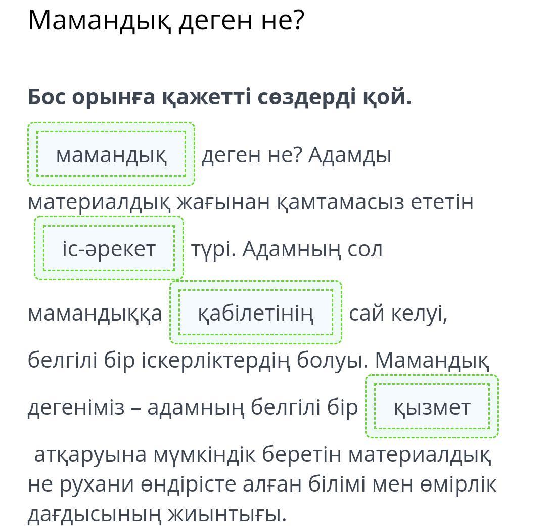 Мамандық деген не? Бос орынға қажетті сөздерді қой. деген не? Адамды материалдық жағынан қамтамасыз ететін түрі. Адамның сол мамандыққа сай келуі, белгілі бір іскерліктердің болуы. Мамандық дегеніміз – адамның белгілі бір атқаруына мүмкіндік беретін материалдық не рухани өндірісте алған білімі мен өмірлік дағдысының жиынтығы. Қажетті сөздер: қабілетінің, мамандық, қызмет, іс-әрекет.Вообщем нужно составить предложения с этими словами вернее подставить их.