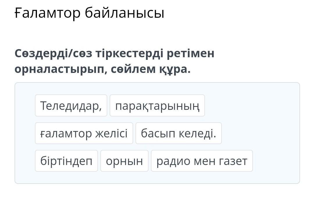 Сөздердi/сөз тіркестердi ретімен орналастырып, сөйлем құра. Теледидар, парақтарының ғаламтор желісі басып келеді. бiртiндеп орнын радио мен газет