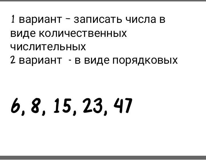 Количественные числительные: Шесть, восемь, пятнадцать, двадцать три, сорок семь.