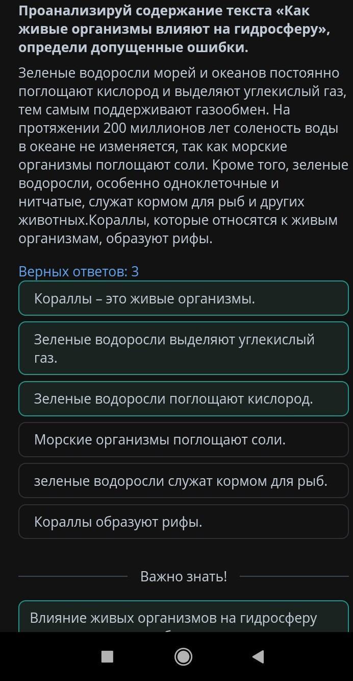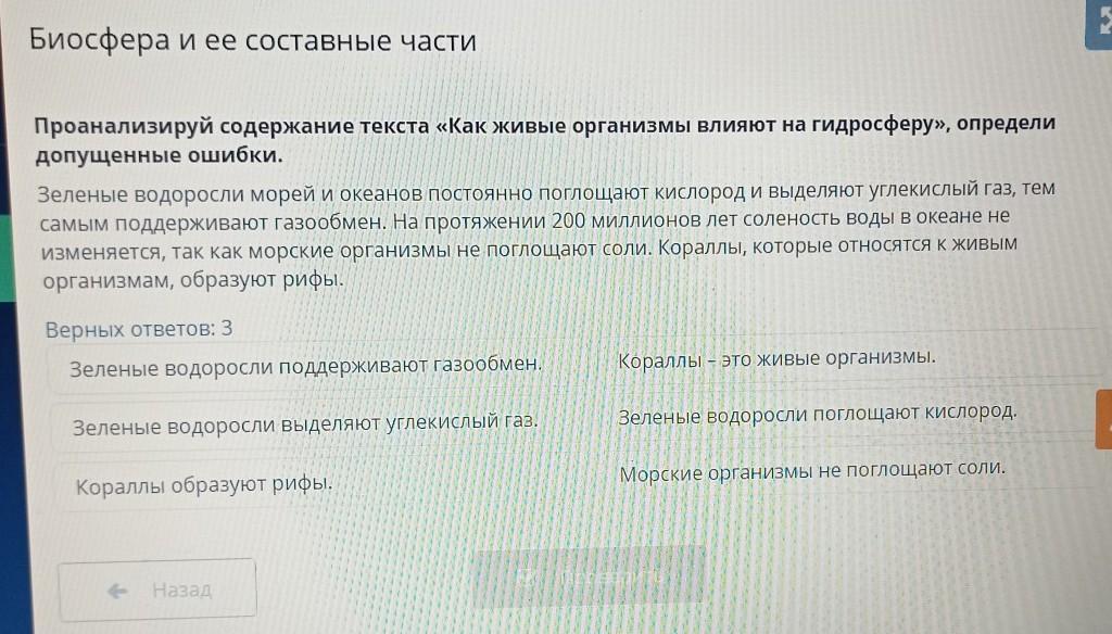 Биосфера и ее составные части Проанализируй содержание текста «Как живые организмы влияют на гидросферу», определи допущенные ошибки. Зеленые водоросли морей и океанов постоянно поглощают кислород и выделяют углекислый газ, тем самым поддерживают газообмен. На протяжении 200 миллионов лет соленость воды в океане не изменяется, так как морские организмы не поглощают соли. Кораллы, которые относятся к живым организмам, образуют рифы. Верных ответов: 3 Зеленые водоросли поддерживают газообмен. Кораллы – это живые организмы. Зеленые водоросли выделяют углекислый газ. Зеленые водоросли поглощают кислород. Кораллы образуют рифы. Морские организмы не поглощают соли. Назад Проверить