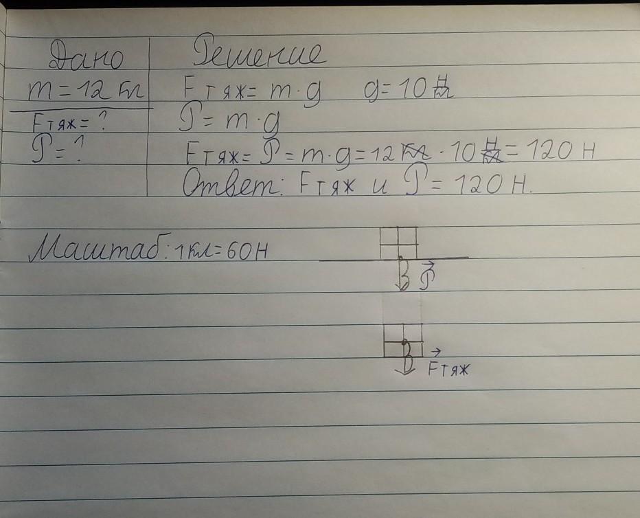На столе стоит коробка с книгами массой 12 кг. Определите силу тяжести и вес коробки. Изобразите эти силы на рисунке.