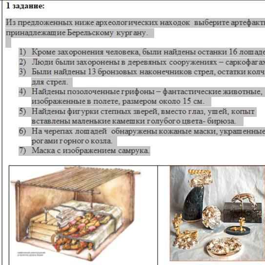 Из предложенных ниже археологических находок выберите артефакты, принадлежащие Берельскому кургану. 1) Кроме захоронения человека, были найдены останки 16 лошадей. 2) Люди были захоронены в деревяных сооружениях – саркофагах. 3) Были найдены 13 бронзовых наконечников стрел, остатки колчана для стрел. 4) Найдены позолоченные грифоны – фантастические животные, изображенные в полете, размером около 15 см. 5) Найдены фигурки степных зверей, вместо глаз, ушей, копыт вставлены маленькие камешки голубого цвета- бирюза. 6) На черепах лошадей обнаружены кожаные маски, украшенные рогами горного козла. 7) Маска с изображением самрука.