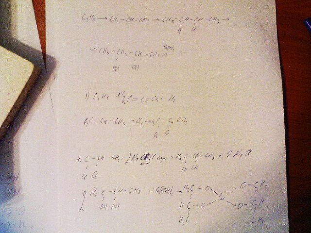 напишите уравнения реакций пр помощи которых можно осуществить превращения C3H8→CH3-CH=CH2→CH3-(вниз CL)-CH(вниз CL)-CH-CH3→CH3-(вниз ОН)-CH(вниз он)-CH2→+Cu(OH)2→→→?