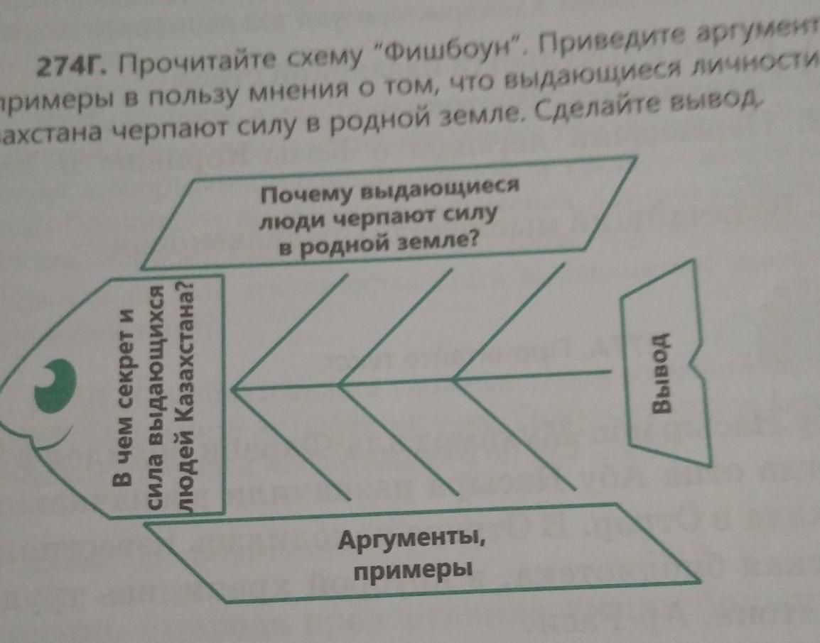 274г. Прочитайте схему "Фишбоун". Приведите аргументы и примеры в пользу мнения о том, что выдающиеся личности ка- захстана черпают силу в родной земле. Сделайте вывод Почему выдающиеся люди черпают силу в родной земле? В чем секрет и сила выдающихся людей Казахстана? toerg Аргументы, примеры