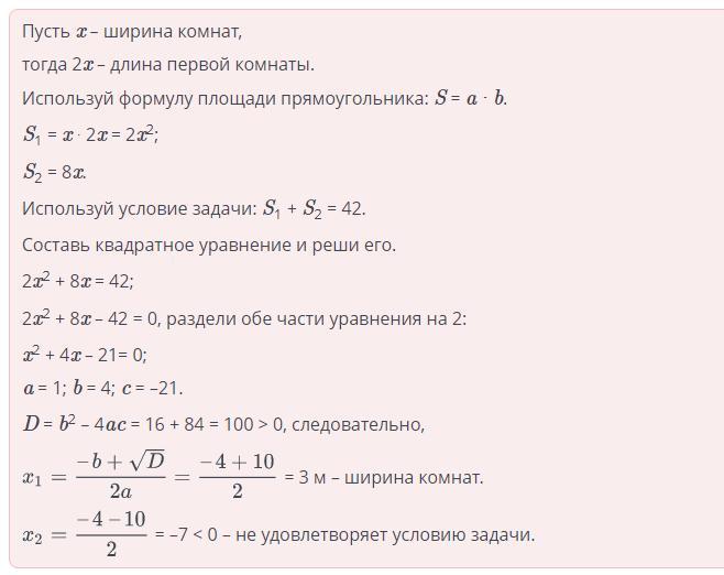 В квартире имеются две комнаты одинаковой ширины. Длина первой комнаты в 2 раза больше ее ширины, а длина второй комнаты равна 8 м. Найди ширину этих комнат, если их площадь равна 42 м2.
