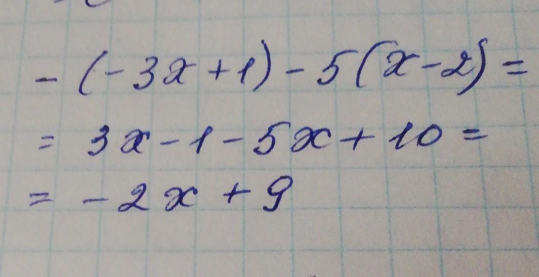 -(-3х+1)-5(x-2) = 3х - 1 - 5х + 10 = 9 - 2х