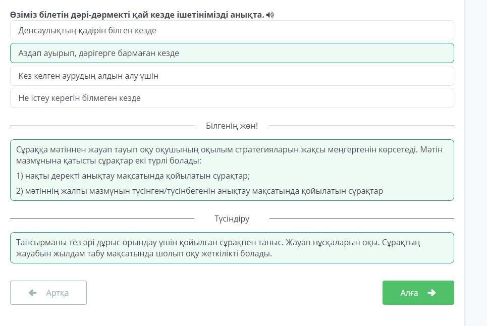 Денсаулық – зор байлық . 1 - сабақ Өзіміз білетін дәрі - дәрмекті қай кезде ішетінімізді анықта . 1.Не істеу керегін білмеген кезде. 2.Аздап ауырып , дәрігерге бармаған кезде. 3.Кез келген аурудың алдын алу үшін. 4.Денсаулықтың қадірін білген  кезде.