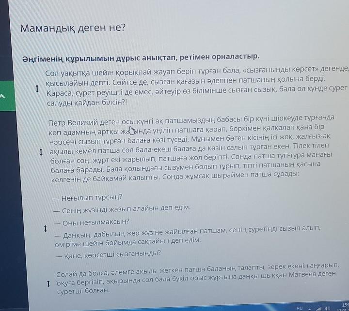 Мамандық деген не? Әңгіменің құрылымын дұрыс анықтап, ретімен орналастыр. Сол уақытқа шейін қорықпай жауап беріп тұрған бала, «сызғаныңды көрсет» дегенде, қысылайын депті. Сөйтсе де, сызған қағазын әдеппен патшаның қолына берді. Қараса, сурет реуішті де емес, әйтеуір өз білімінше сызған сызық, бала ол күнде сурет салуды қайдан білсін?! I Петр Великий деген осы күнгі ақ патшамыздың бабасы бір күні шіркеуде тұрғанда Көп адамның артқы жабында үңіліп патшаға қарап, бөркімен қалқалап қана бір нәрсені сызып тұрған балаға көзі түседі. Мұнымен бөтен кісінің ісі жоқ, жалғыз-ақ І ақылы кемел патша сол бала-екеш балаға да көзін салып тұрған екен. Тілек тілеп болған соң, жұрт екі жарылып, патшаға жол беріпті. Сонда патша тұп-тура манағы балаға барады. Бала қолындағы сызумен болып тұрып, тіпті патшаның қасына келгенін де байқамай қалыпты. Сонда жұмсақ шыраймен патша сұрады: І Неғылып тұрсың? — Сенің жүзіңді жазып алайын деп едім. Оны неғылмақсың? - Даңқың, дабылың жер жүзіне жайылған патшам, сенің суретіңді сызып алып, өміріме шейін бойымда сақтайын деп едім. - Қане, көрсетші сызғаныңды? Солай да болса, әлемге ақылы жеткен патша баланың талапты, зерек екенін аңғарып, І оқуға бергізіп, ақырында сол бала бүкіл орыс жұртына даңқы шыққан Матвеев деген суретші болған.
