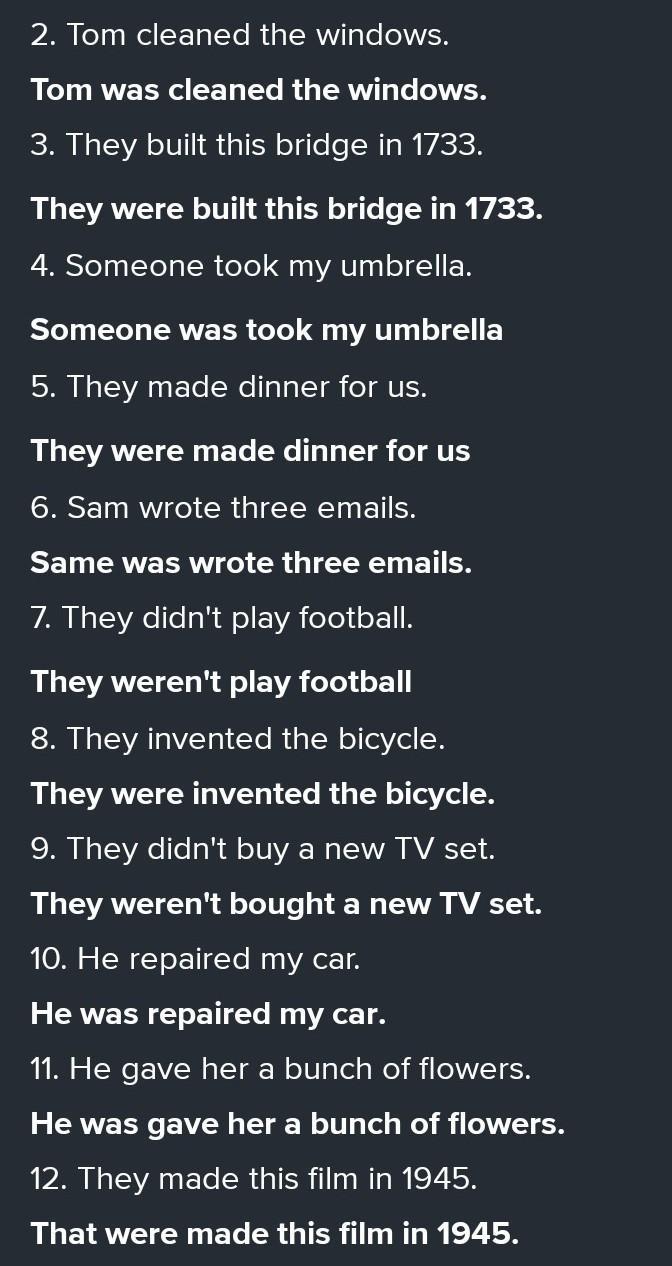 Rewrite the sentences to make past passive voice. 1. Columbus discovered America. 2. Tom cleaned the windows. 3. They built this bridge in 1733. 4. Someone took my umbrella. 5. They made dinner for us. 6. Sam wrote three emails. 7. They didn't play football. 8. They invented the bicycle 9. They didn't buy a new TV set. 10. He repaired my car. 11. He gave her a bunch of flowers. 12. They made this film in 1945.