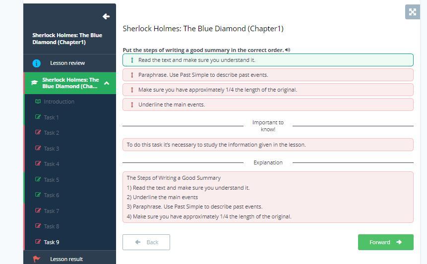 Sherlock Holmes: The Blue Diamond (Chapter1) Put the steps of writing a good summary in the correct order. 4) I Underline the main events. Make sure you have approximately 1/4 the length of the original. Read the text and make sure you understand it. Paraphrase. Use Past Simple to describe past events.