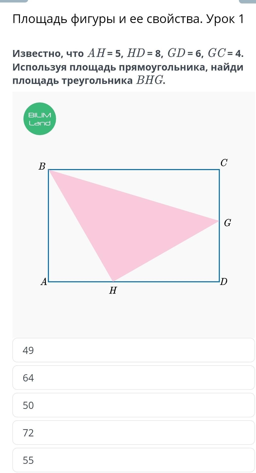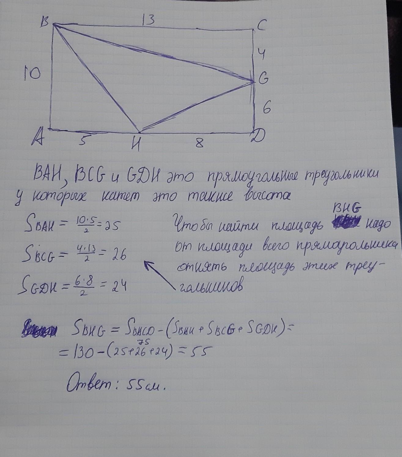 Известно, что АН=5, HD = 8, GD=6, GC = 4. Используя площадь прямоугольника, найди площадь треугольника ВНG.