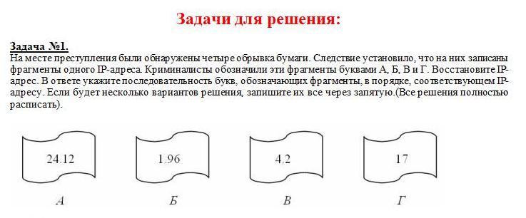 На месте преступления были обнаружены четыре обрывка бумаги. Следствие установило, что на них записаны фрагменты одного IP-адреса. Криминалисты обозначили эти фрагменты буквами А, Б, В и Г. Восстановите IP-адрес. В ответе укажите последовательность букв, обозначающих фрагменты, в порядке, соответствующем IP-адресу. Если будет несколько вариантов решения, запишите их все через запятую.(Все решения полностью расписать).