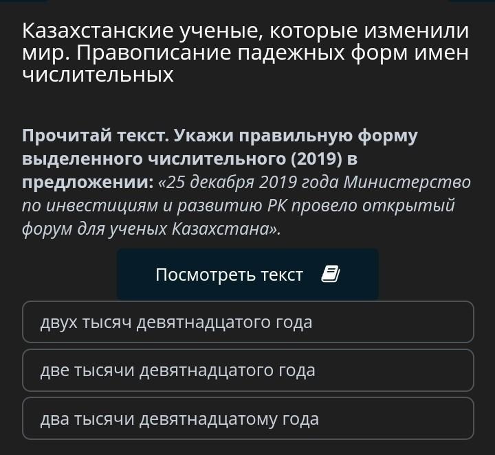 Казахстанские ученые, которые изменили мир. Правописание падежных форм имен числительных Прочитай текст. Укажи правильную форму выделенного числительного (2019) в предложении: «25 декабря 2019 года Министерство по инвестициям и развитию РК провело открытый форум для ученых Казахстана». Посмотреть текст двух тысяч девятнадцатого года две тысячи девятнадцатого года два тысячи девятнадцатому года