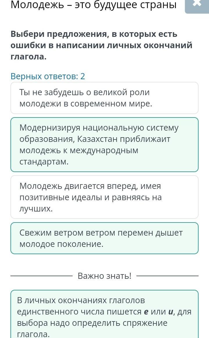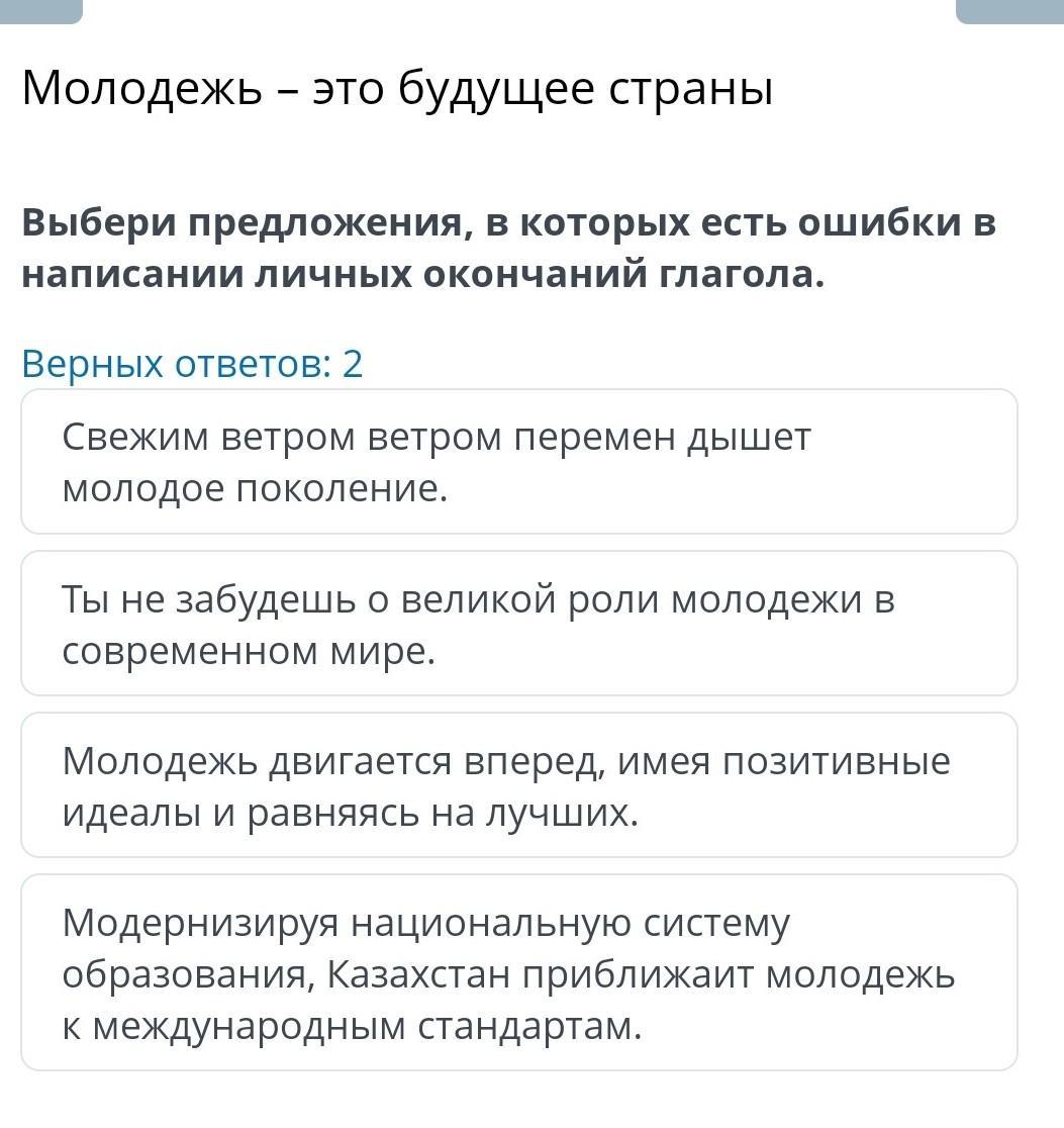ПОМОГИТЕ ПЛИЗ ДАМ 20 Б Молодежь - это будущее страны Выбери предложения, в которых есть ошибки в в написании личных окончаний глагола. Верных ответов: 2 Молодежь движется вперед, имея позитивные идеалы и равняясь на лучших. Модернизируя национальную систему образования, Казахстан привлекает молодежь к международным стандартам. Ты не забудешь о великой роли молодежи в в современном мире. Новым ветром ветер перемен дышет молодое поколение.