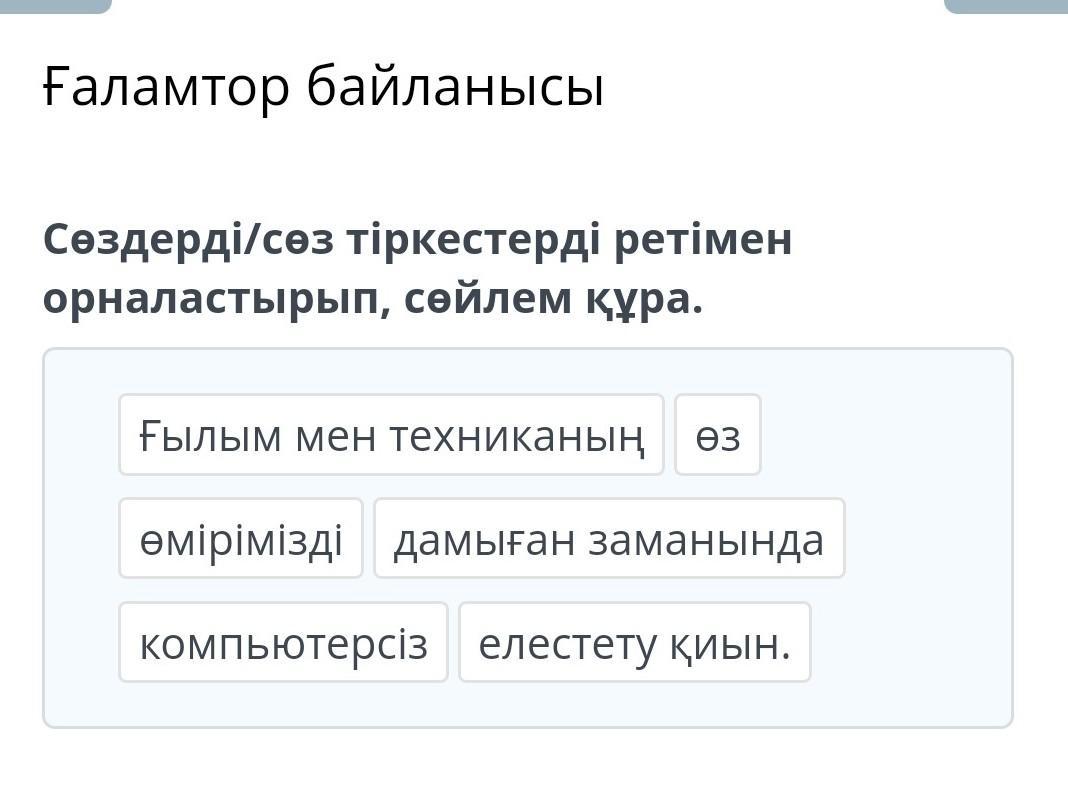 Ғаламтор байланысы Сөздерді/сөз тіркестерді ретімен орналастырып, сөйлем құра. Ғылым мен техниканың өз өмірімізді дамыған заманында компьютерсіз елестету қиын.