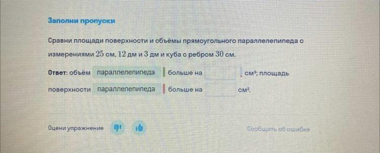 S= 2*(a*b+b*c+a*c)= 2 (2,5* 12+ 12*3+2,5* 3) = 2(30+36 + 7,5)= 147 см²