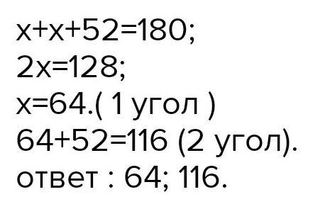 Один из смежных углов, образованных при пересечения двух прямых, на 52* больше другого. Найдите все образовавшиеся при этом углы.