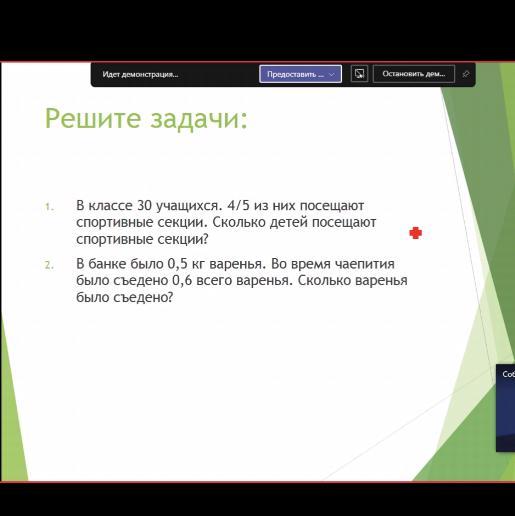 30*4/5=24 ребёнка посещают спорт.секции, 0,5*0,6=0,3 кг съели