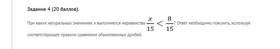 При каких натуральных значениях x выполняется неравенство primery.jpg? Ответ необходимо пояснить, используя соответствующее правило сравнения обыкновенных дробей.