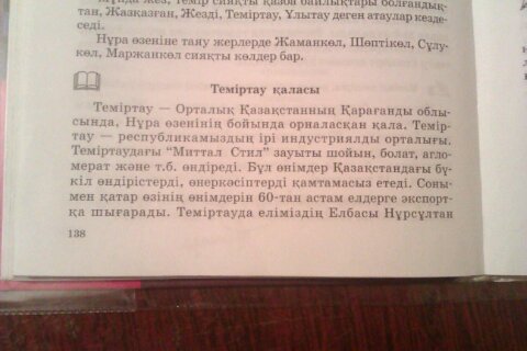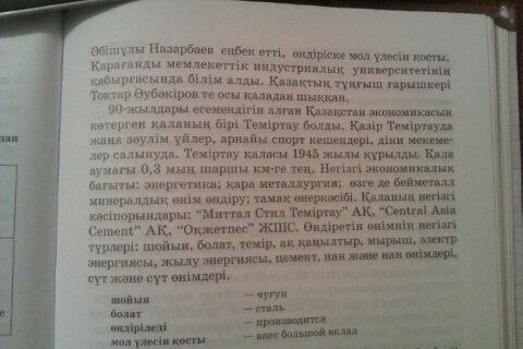 Темиртау- город, расположенный в центральном Казахстане в Карагандинской области, на берегу реки Нура. Темиртау - крупный индустриальный центр нашей республики. Темиртауский завод «Митал Стил» выпускает чугун, сталь, производство агломерата и так далее. Это производство по всему Казахстану, оно обеспечивает промышленность. Вместе с этим свои продукты экспортируют в более 60 стран. В Темиртау наш президент Нурсултан Абишевич Назарбаев работал, внес свой вклад в производство. Он учился в Карагандинском государственном индустриальном университете. Первый казахский космонавт Тохтар Аубакиров тоже из этого города.