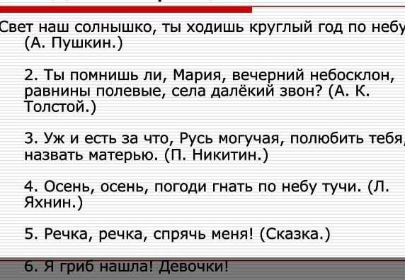 Ответ:1свет наш солнышко,2мария,3русь могучая,4осень, осень,5речка,речка,6девочки!