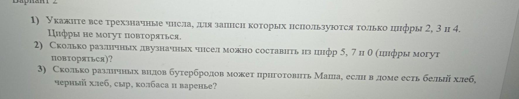 1) Укажите все трехзначные числа, для записи которых используются только цифры 2, 3 и 4.
