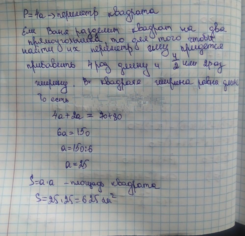Ваня разрезал квадратный лист бумаги на два прямоугольника. Их периметры оказалось равны 70 см и 80 см. Найдите площадь целого листа