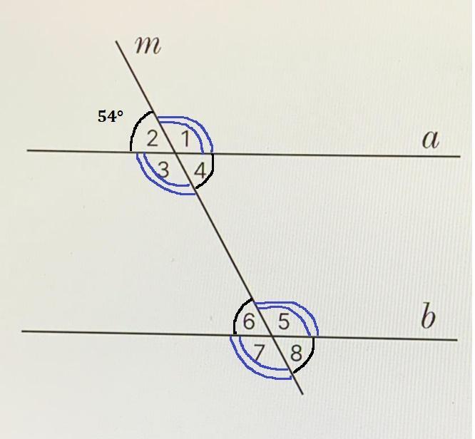 На рисунке две прямые а и b пересечены прямой m так, что угол 2 = 54°.