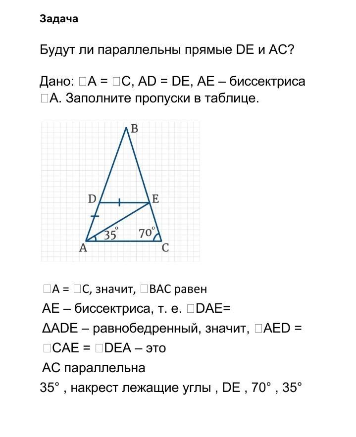 т. к. AE биссектриса угла DAC тогда угол DAE =35° из условия мы знаем что треугольник DAE равнобедренный это значит что углы при основании равны DAE=AED=35° т. к сумма угол треугольника равна 180° угол ADE= 180-35×2