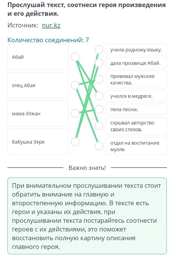 Прослушай текст, соотнеси героя произведения и его действия.