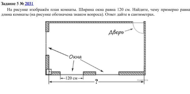 Пожалуйста, помогите! На рисунке изображён план комнаты. Ширина окна равна 120 см. Найдите, чему примерно равна длина комнаты (на рисунке обозначена знаком вопроса). Ответ дайте в сантиметрах.