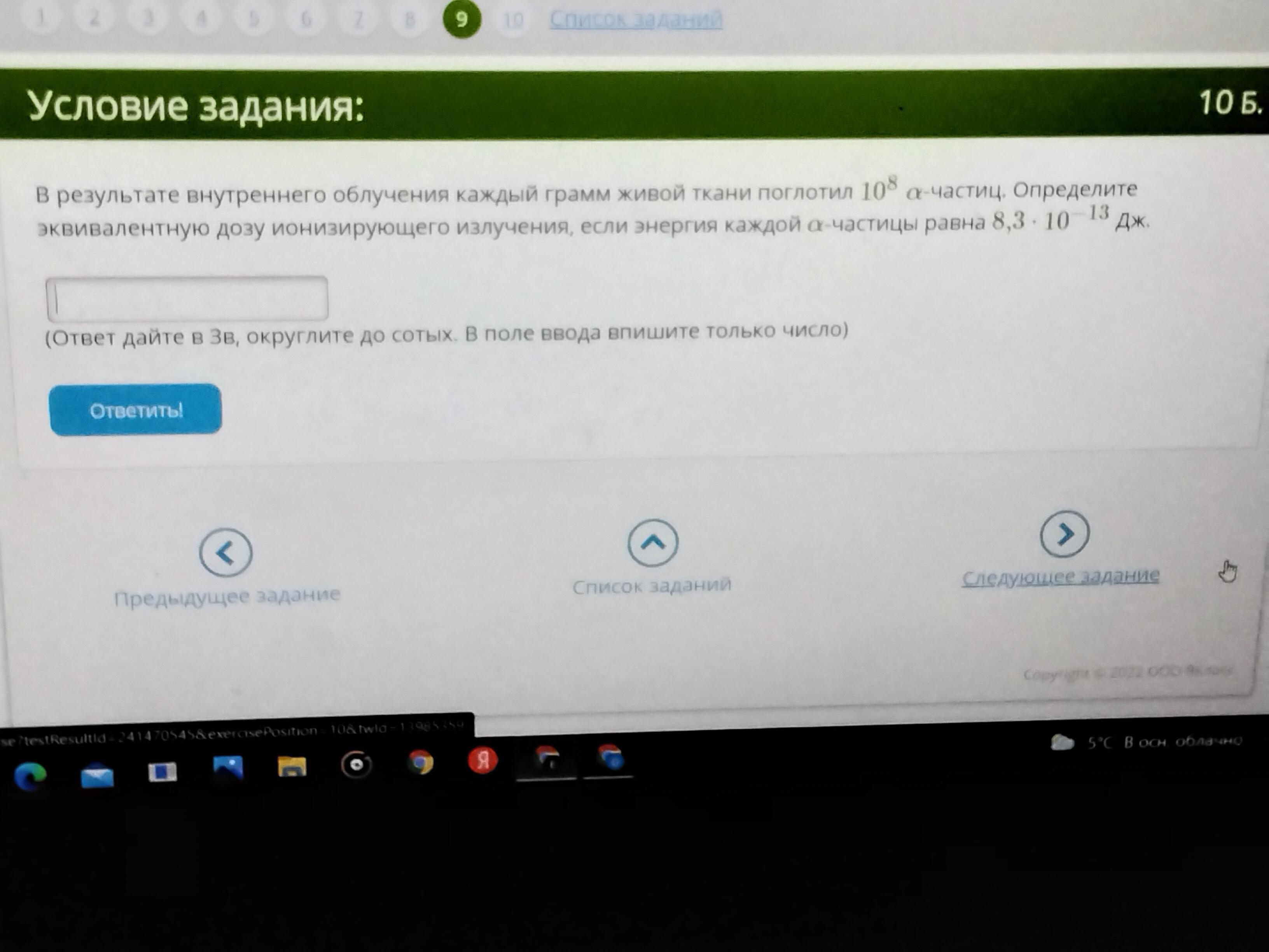 В результате внутреннего облучения каждый грамм живой ткани поглотил 10⁸ α-частиц. Определите эквивалентную дозу ионизирующего излучения, если энергия каждой сын частицы равна 8,3·10⁻¹³ Дж.