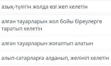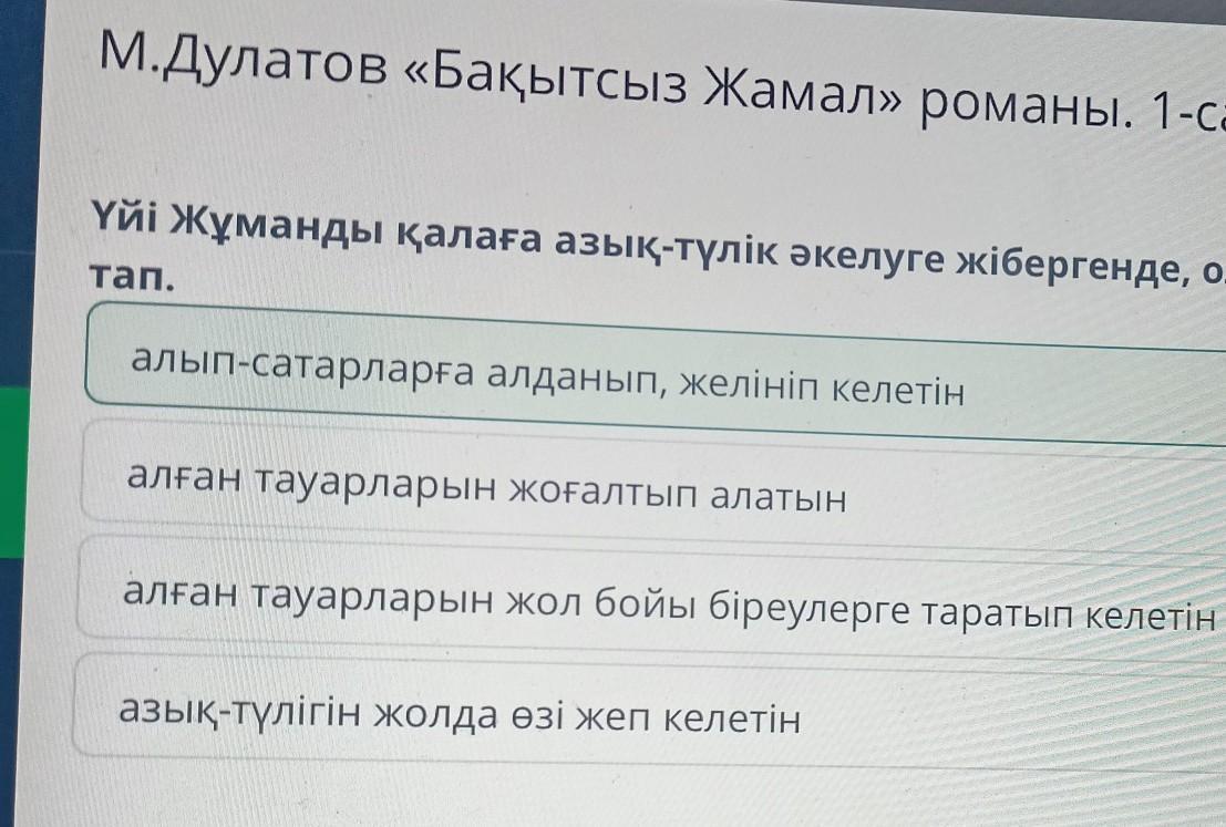 М.Дулатов «Бақытсыз Жамал» романы. 1-сабақ Үйі жұманды қалаға азық түлік әкелуге жібергенде,ол үйіне қалай оралғанын тап. 1.азық-түлігін жолда өзі жеп келетін. 2 алған тауарларын жол бойы біреуге таратып келген. 3.алған тауарларын жоғалтып алатын. 4.алып-сатарларға алданып,желініп келетін.
