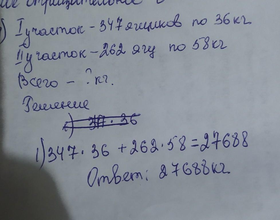на первом участке было 347 ящиков по 36 кг а на втором 262 ящика по 58 кг