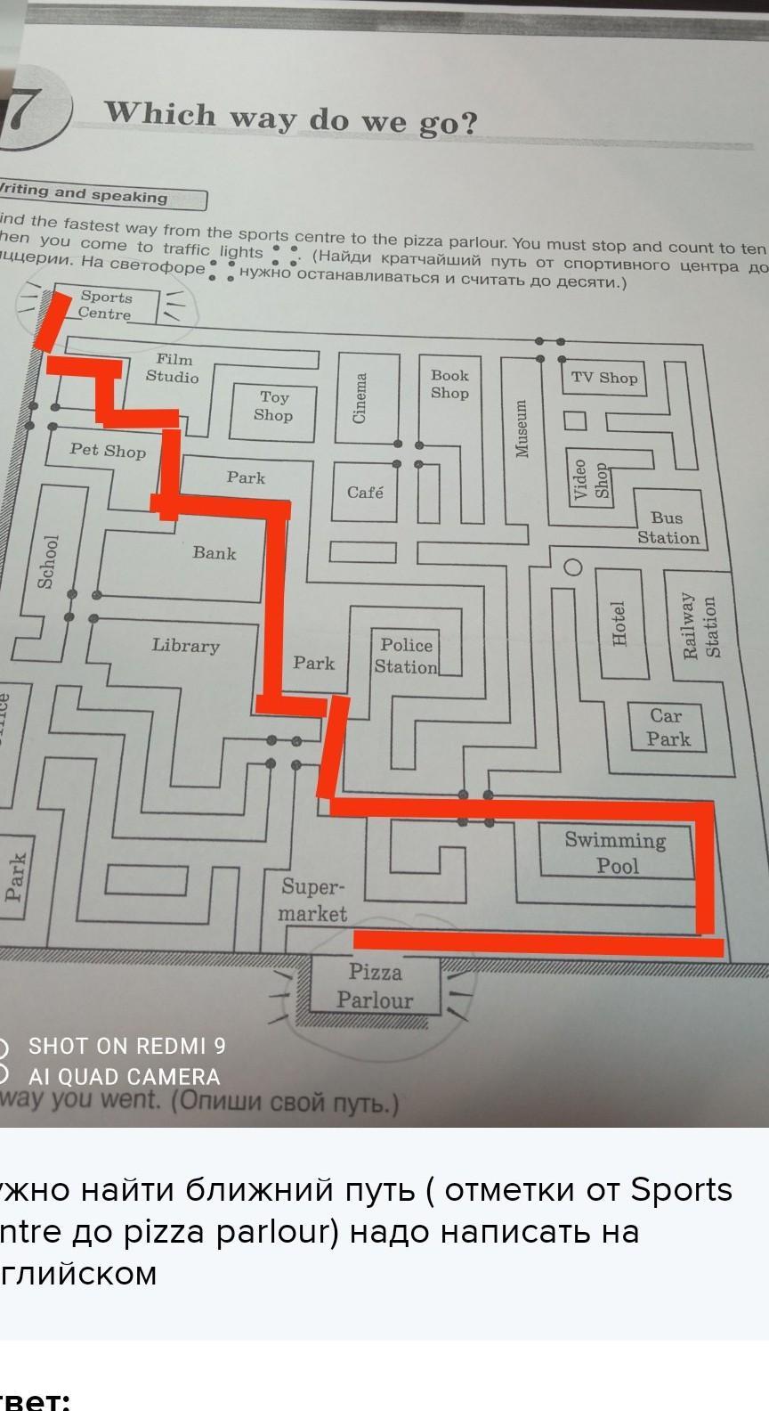 Нужно найти ближний путь ( отметки от Sports centre до pizza parlour) надо написать на английском