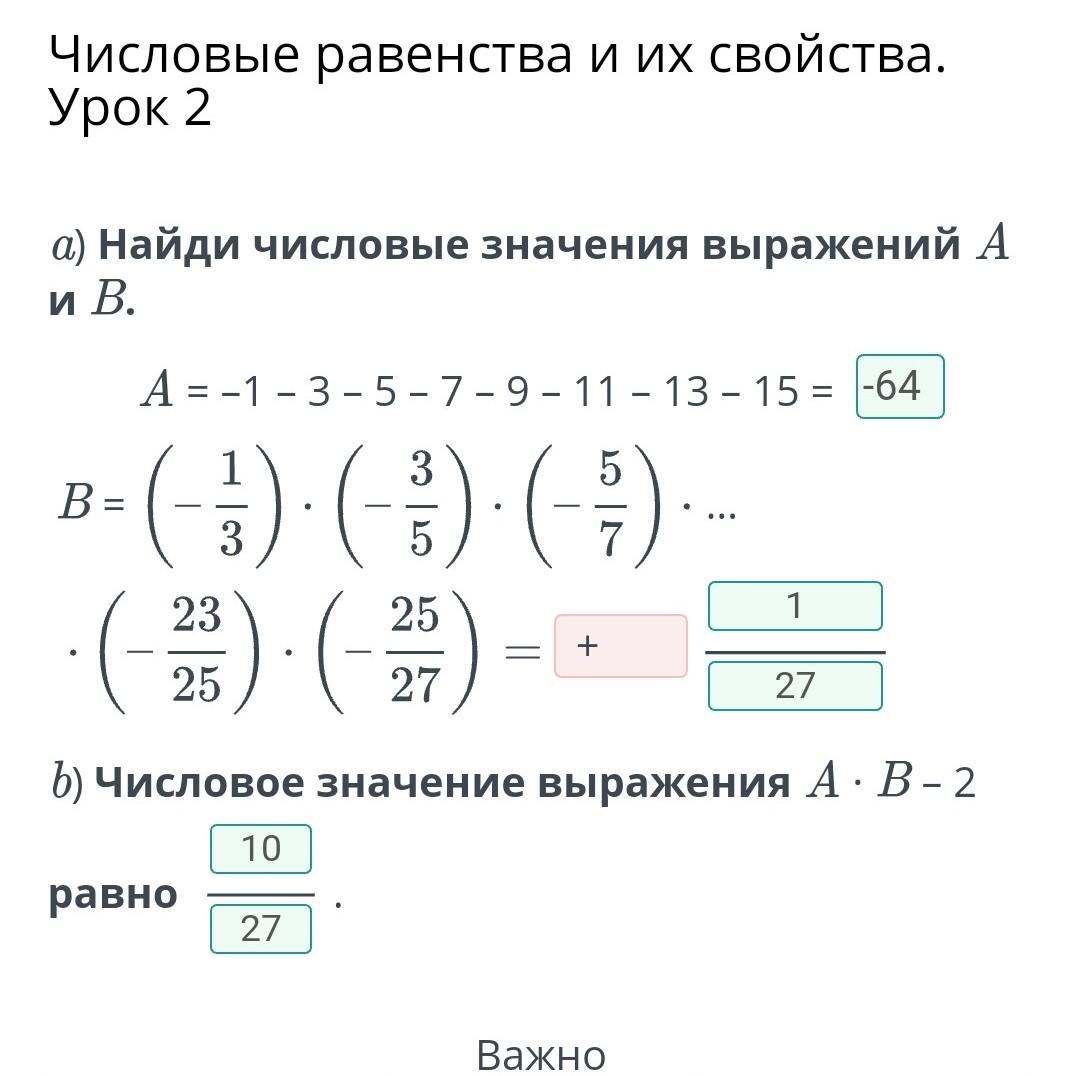а)найди числовые значения выражений А и В А=-1-3-5-7-9-11-13-15= В=(-1/3)*(-3/5)*(-5/7)*(-23/25)*(-25/27= b) Числовое значение выражения А*В-2 равно