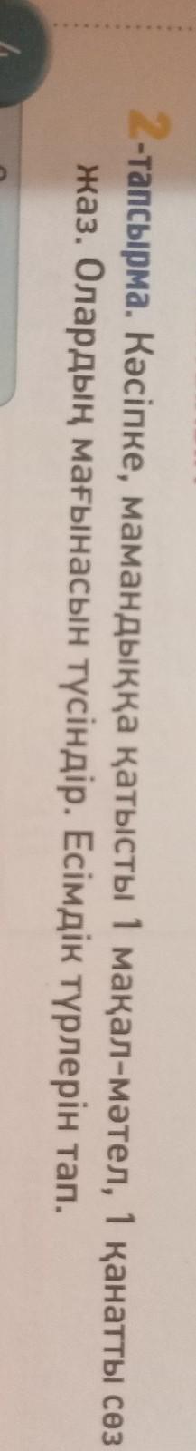 тапсырма. Кәсіпке, мамандыққа қатысты 1 мақал-мәтел, 1 қанатты сөз маз. Олардың мағынасын түсіндір. Есімдік түрлерін тап. NA