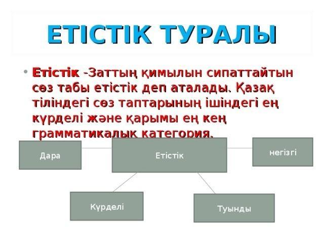 Етістік — заттың қимылын, іс-әрекетін, күй-жайын білдіретін сөз табы. Етістік не істеді? не қылды? қайтті? (немесе не істеп? қайтіп? не істесе? т. б. тұлғалардағы) деген сұрақтарға жауап береді.