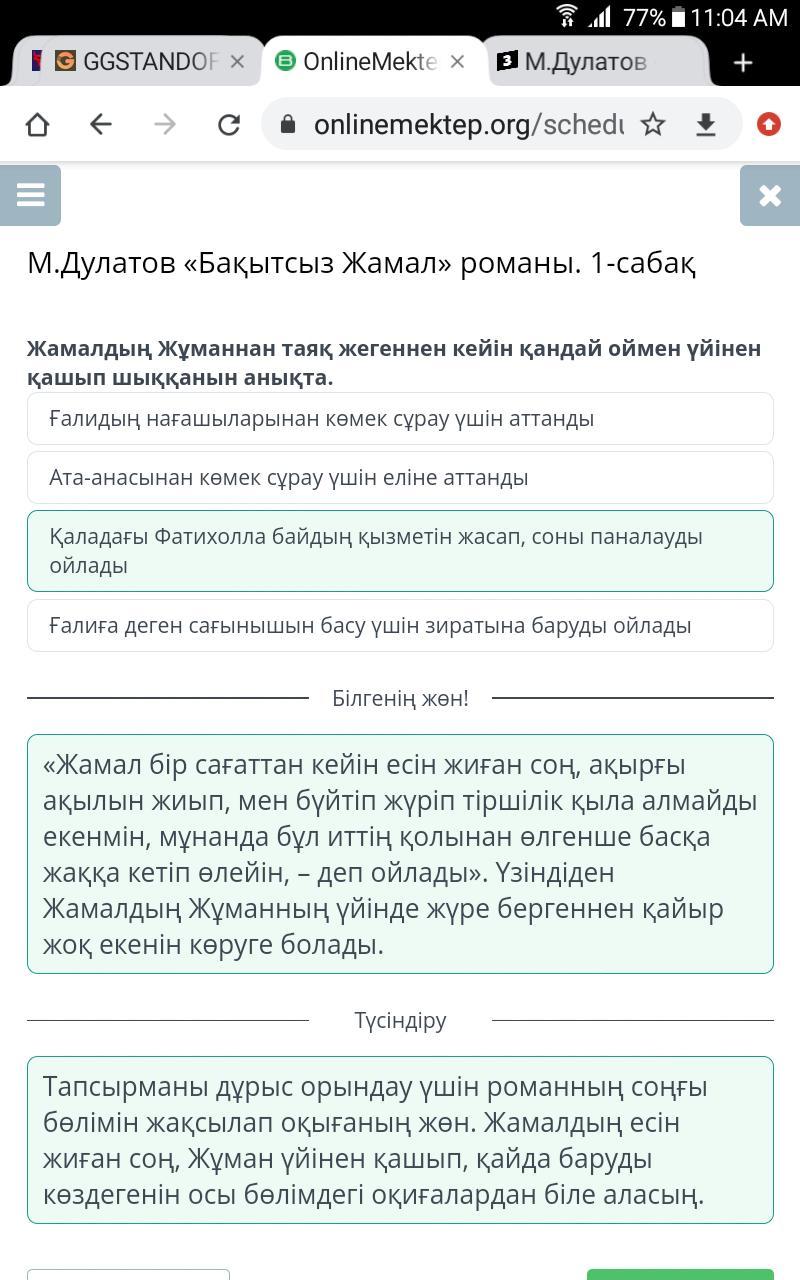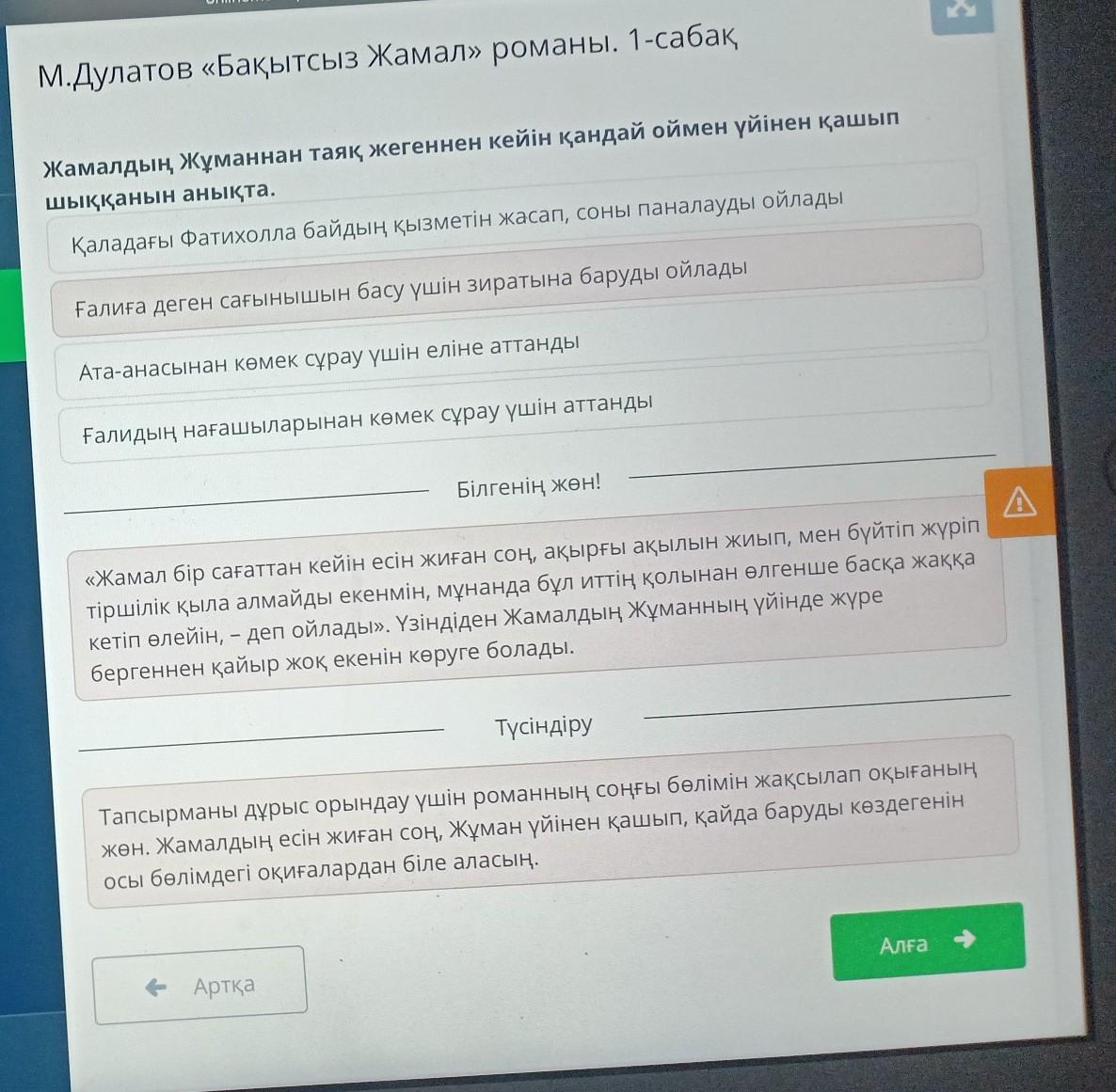 М.Дулатов «Бақытысыз жамал»романы 1 сабақ.Жамалдың Жұманнан таяқ жегеннен кейін қандай оймен үйінен қашып шыққанын анықта.(соңғысын байқамай басып қойдым)