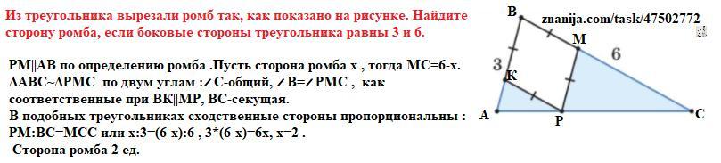 Из треугольника вырезали ромб так, как показано на рисунке. Найдите сторону ромба, если боковые стороны треугольника равны 3 и 6.