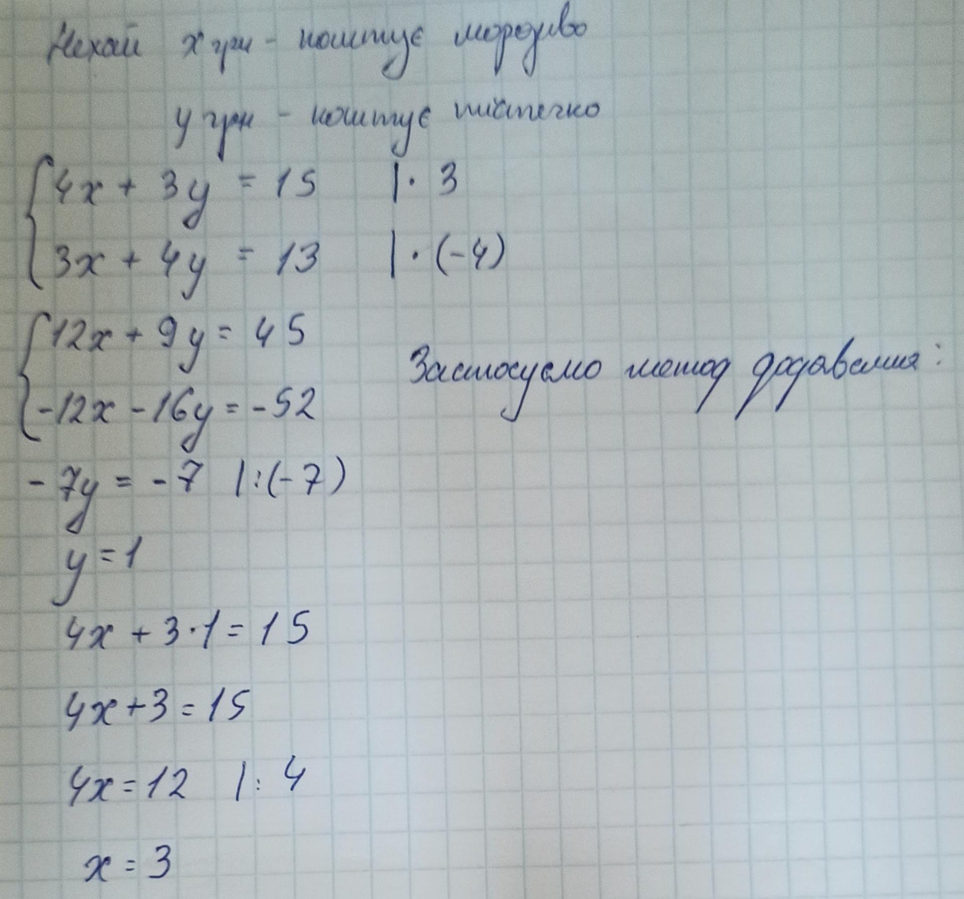 Чотири морозива и три тістечка коштують 15 грн, а три морозива та чотири тістечка 13 грн. Скільки коштує одне морозиво й одне тістечко?