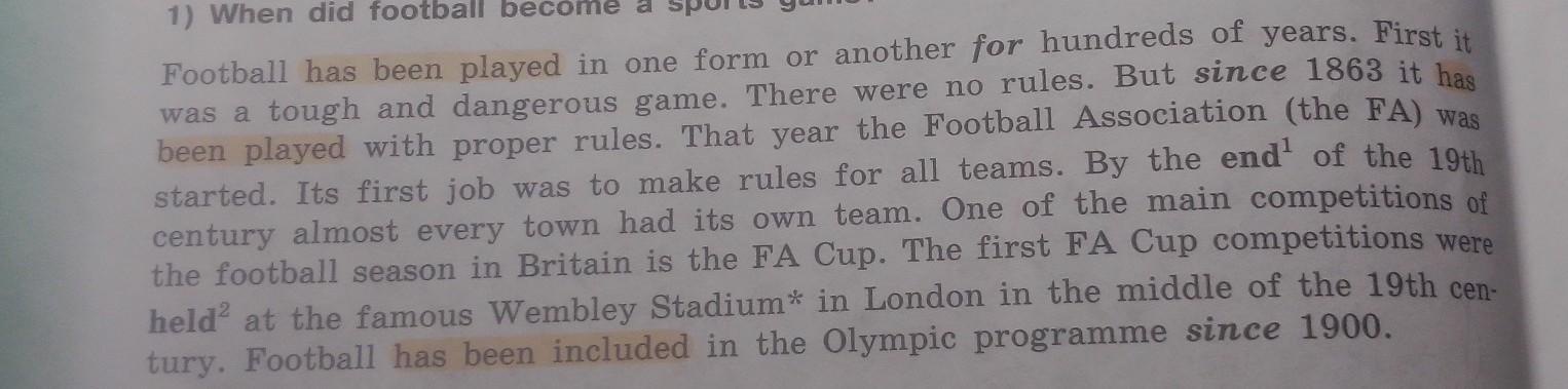 В футбол в той или иной форме играют сотни лет. Сначала это была тяжелая и опасная игра. Правил не было. Но с 1863 года в нее играют по надлежащим правилам. В том же году была основана Футбольная ассоциация (FA). Его первой задачей было разработать правила для всех команд. К концу 19 века почти в каждом городе была своя команда. Одним из главных соревнований футбольного сезона в Британии является Кубок Англии. Первые соревнования Кубка Англии прошли на знаменитом стадионе Уэмбли* в Лондоне в середине 19 века. Футбол включен в олимпийскую программу с 1900 года.