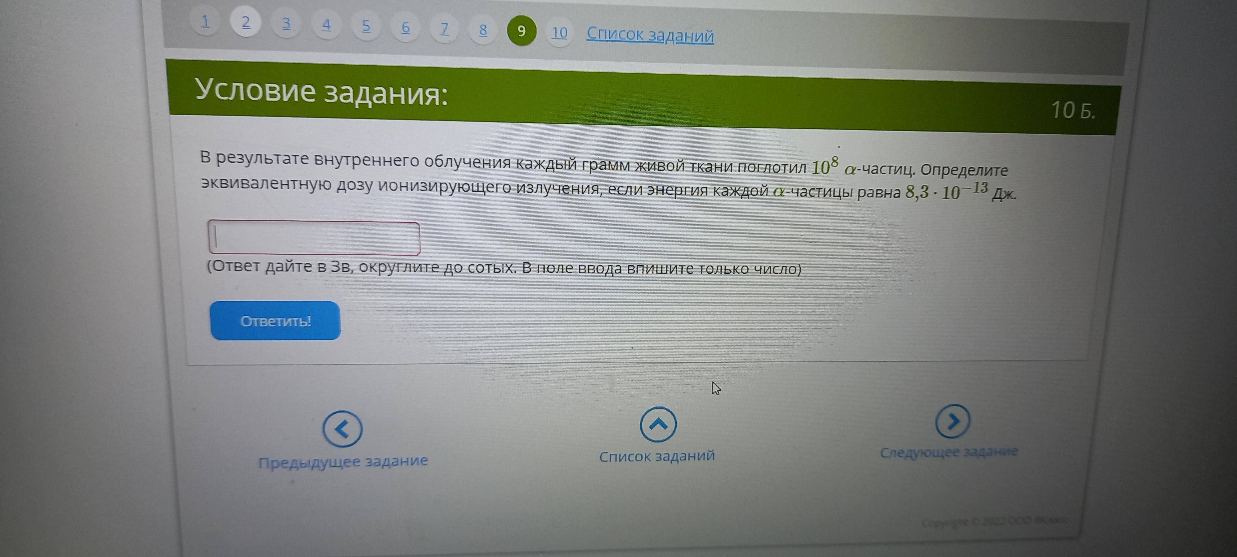 В результате внутреннего облучения каждый грамм живой ткани поглотил 10⁸ α-частиц. Определите эквивалентную дозу ионизирующего излучения, если энергия каждой сын частицы равна 8,3·10⁻¹³ Дж.