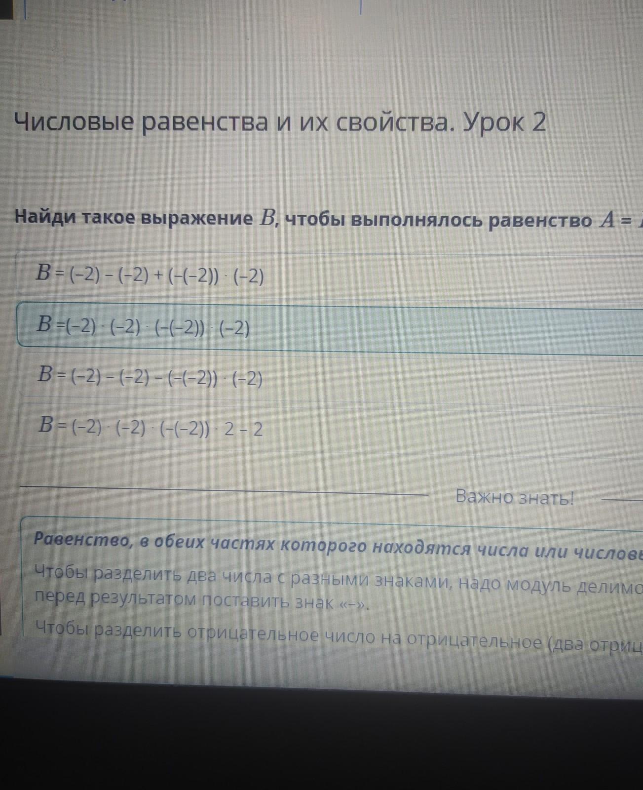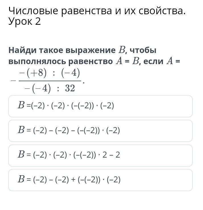 Числовые равенства и их свойства. Урок 2 Найди такое выражение B, чтобы выполнялось равенство A = B, если A = B =(–2) ∙ (–2) ∙ (–(–2)) ∙ (–2) B = (–2) – (–2) – (–(–2)) ∙ (–2) B = (–2) ∙ (–2) ∙ (–(–2)) ∙ 2 – 2 B = (–2) – (–2) + (–(–2)) ∙ (–2) Назад Проверить